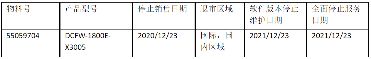 北京神州数码云科信息技术有限公司正式通知您, 以上DCFW-1800E-X3005下一代防火墙(55059704)将于20201223号停止接收新的订单(具体日期见上表),不再供货。给您带来的不便,敬请原谅。